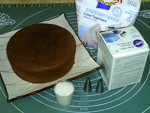 6寸可可戚風蛋糕1個,動物性淡奶油350克,糖35克,可可粉適量,巧克力醬適量,色素少許