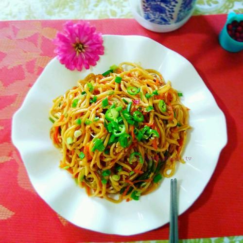 7.再倒入面條翻炒,加入2湯勺生抽,一勺蠔油,胡椒粉適量,把面條與蔬菜絲翻炒均勻就可以出鍋了