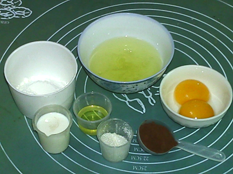 用料:牛奶30克,玉米油12克,可可粉7克,低筋粉31克,蛋黃31克,蛋白75克,細(xì)砂糖45克