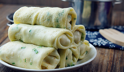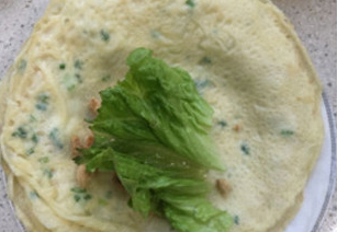 3再分別將肉松,生菜包在餅皮里,卷好擺盤即可享用。