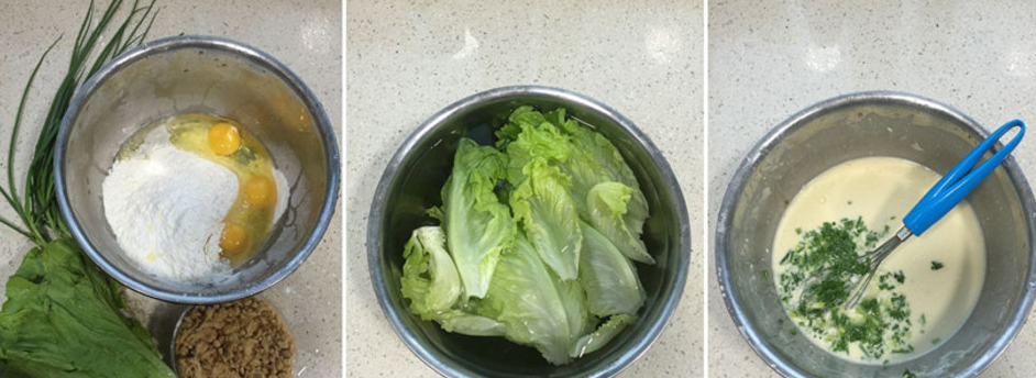 1備好所用食材,生菜用細鹽水泡洗,除肉松外,其它食材拌至在一起,加入適量清水,拌至面糊很滑動,再加入適量細鹽調(diào)味。