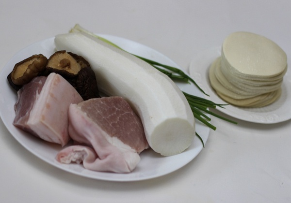 白蘿卜 一根、豬肉 300克、干香菇 20克、餃子皮 適量、青蒜苗 三棵、小蔥 兩棵、生姜 一塊、雞蛋 一個(gè)、油 適量、鹽 適量、生抽 適量、黑胡椒粉 適量、香油 適量