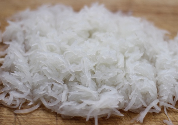 7、將蘿卜絲、肉泥、蔥姜末、香菇末倒一起,打入雞蛋,加入適量鹽、生抽、香油、少許黑胡椒粉,充分拌勻
