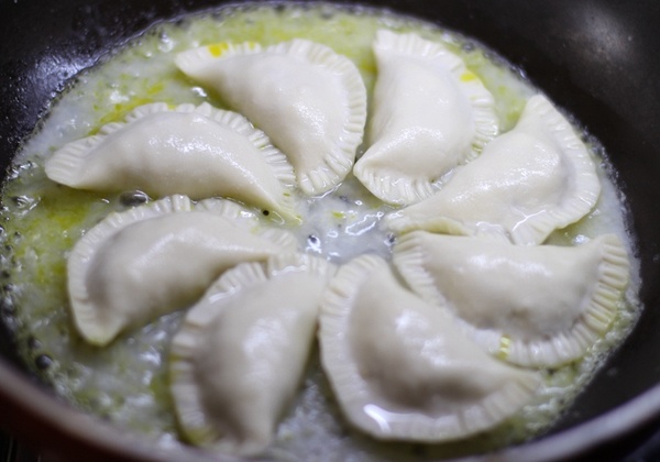10、鍋里加入適量油,均勻鋪好餃子,中小火煎半分鐘