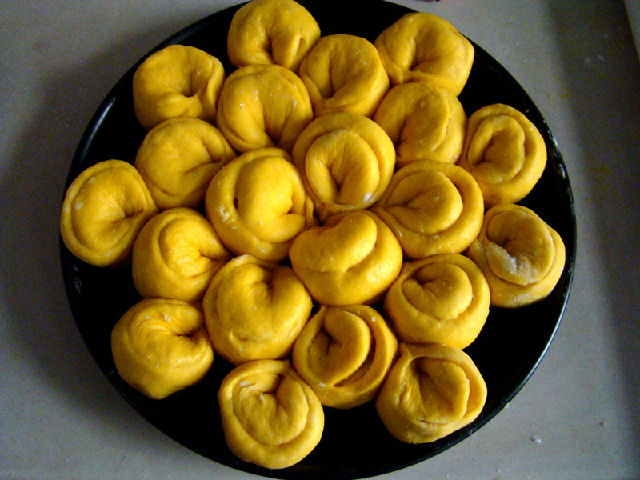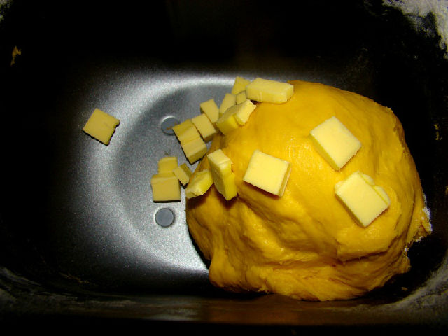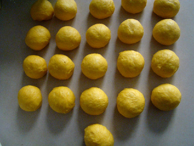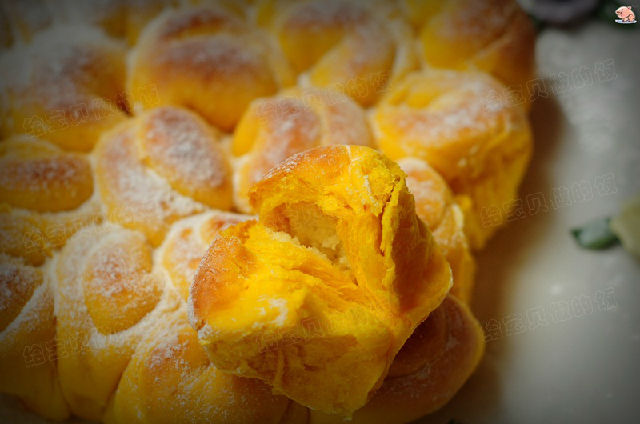 面團(tuán)原料:高粉300克,南瓜泥200克,糖20克,鹽3克,雞蛋1個(gè),酵母3克,黃油25克