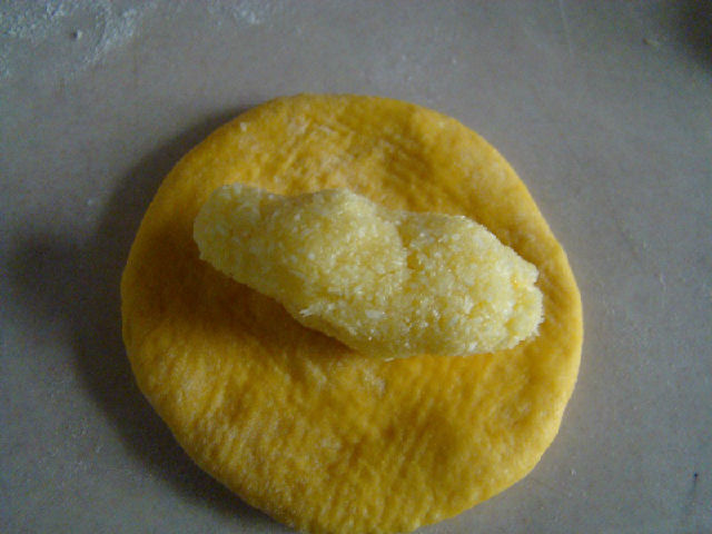 11,椰蓉餡也等分成21份,取一份面團(tuán)用手摁扁,放入椰蓉餡。