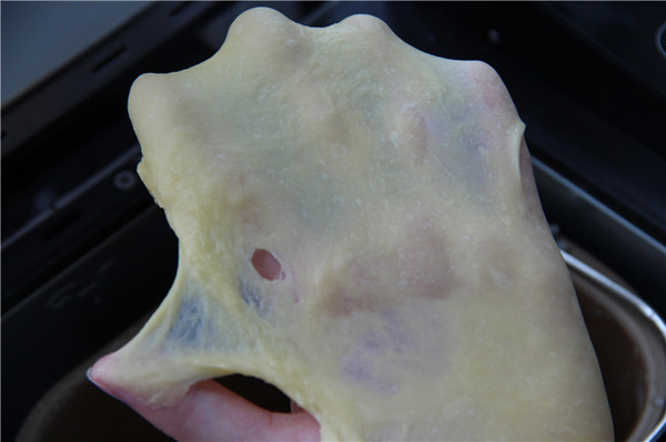 2、再加入黃油繼續(xù)揉面,直至面團(tuán)能拉出薄薄的手套膜即可