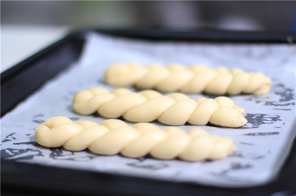 5、綁好以后排在烤盤上,放入烤箱發(fā)酵至2倍大