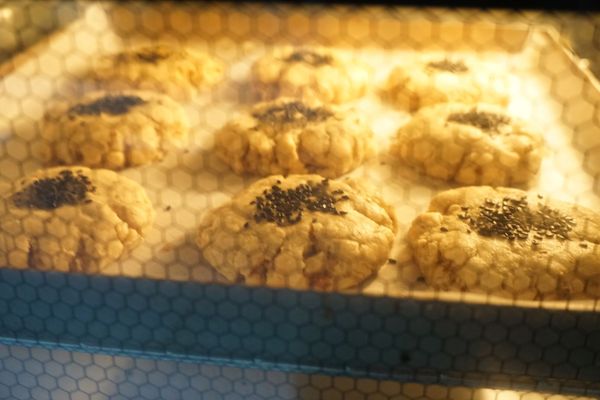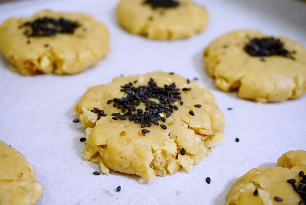 6、40克一個,揉成圓球,用手心按扁,再撒上適量黑芝麻。