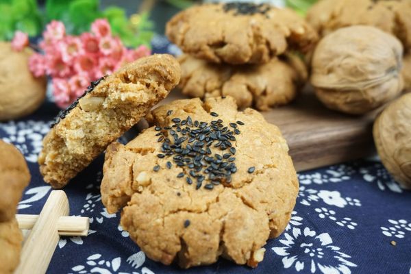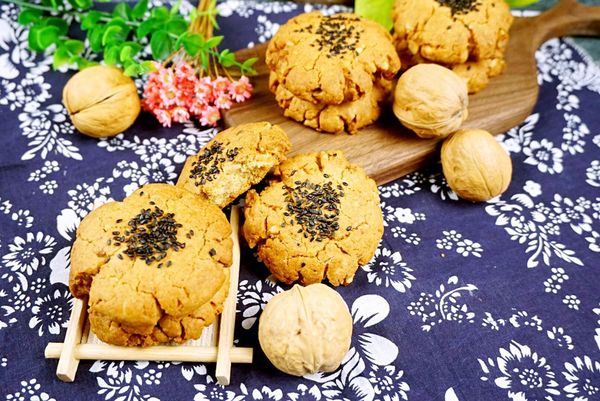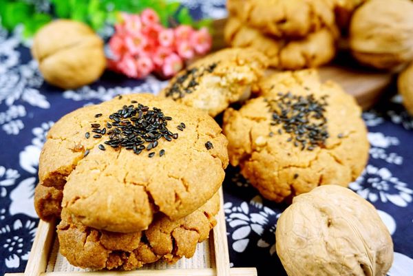 植物油:100克、雞蛋:1個、糖:100克、全麥粉:100克、低筋面粉:150克、小蘇打:2克、鹽:2克、核桃仁:60克、熟黑芝麻:適量