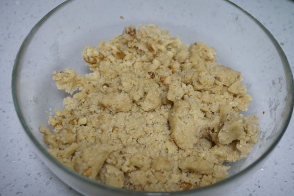 5、篩入面粉后倒入核桃碎,看不到干粉就行,不用揉的太細。