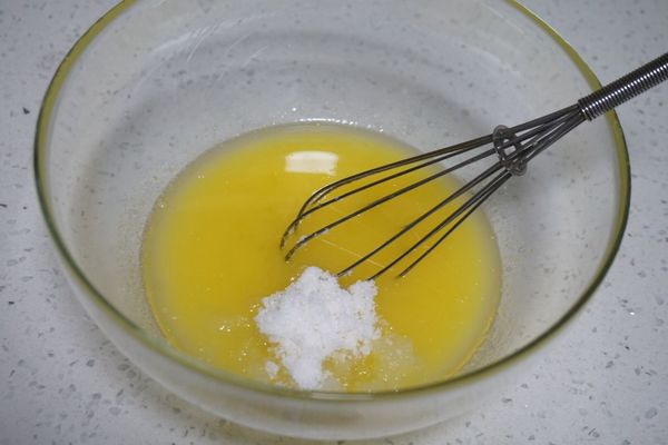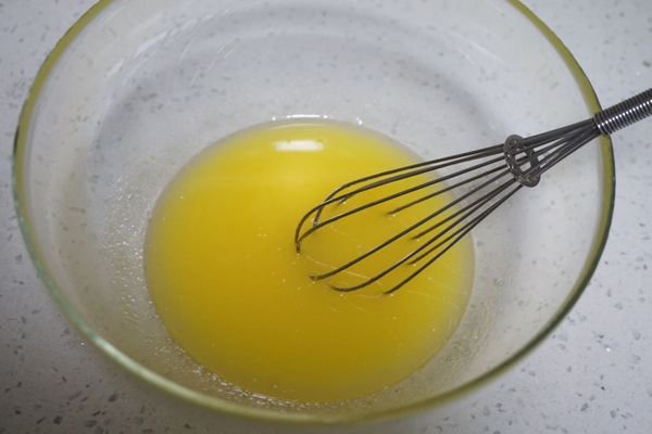 1、打蛋盆中放入植物油和一個雞蛋,攪拌均勻。