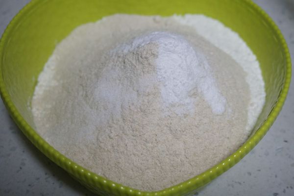 4、低筋面粉、全麥粉和小蘇打、鹽混合。