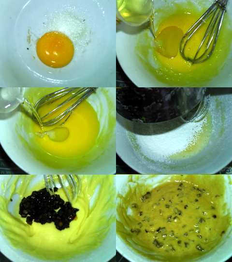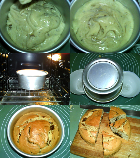 倒入六寸圓模。震平表面。放入烤箱,中下層,上下火150度,烤約40分鐘左右。出爐后立即倒扣。冷卻后翻面。脫模,切塊食用。