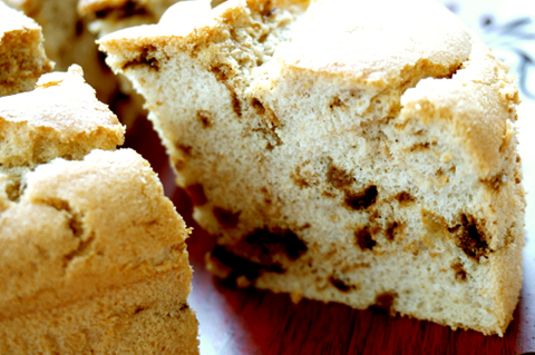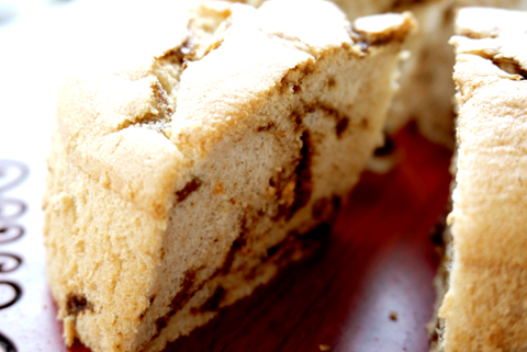 果粒戚風(fēng)沒什么稀奇,重點(diǎn)是,那肉桂糖漿的紋理。想象中,肉桂糖漿澆在面糊表面,隨意劃拉幾下,就可以得到好看的紋理。沒想到,肉桂糖漿如此粘稠,剛開始向面糊滴落,便嘩啦一下子全都出溜出去,并且,質(zhì)重下沉,很快隱入面糊。趕緊手忙腳亂東一下西一下把它們劃拉開。也不知是不是完全成功,卻也不敢久劃,估摸著差不多了,趕緊入模烘烤。