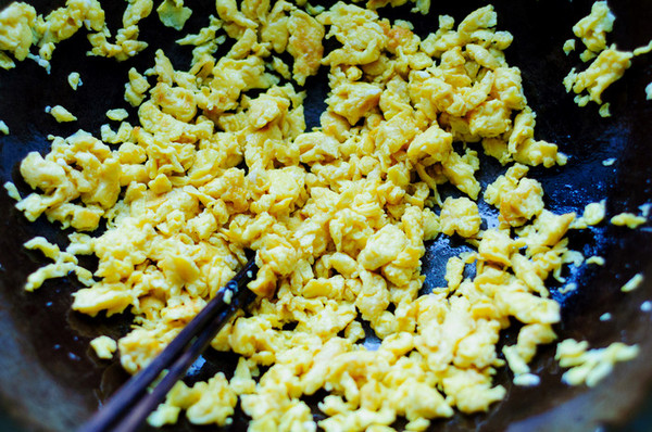 5、雞蛋攪打成雞蛋液,炒鍋里倒入10g油燒熱后倒進(jìn)雞蛋液,小火把雞蛋液炒成雞蛋碎。