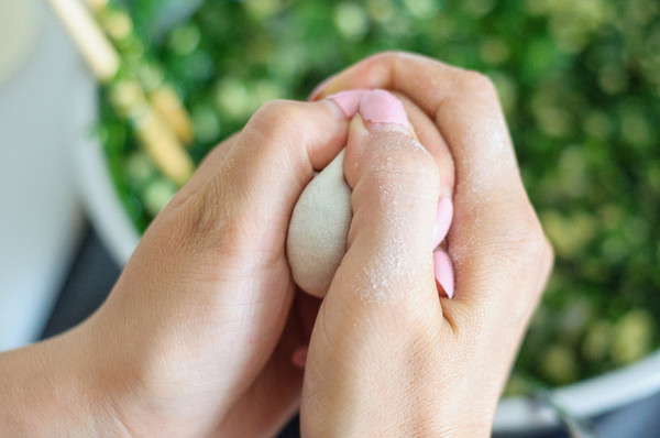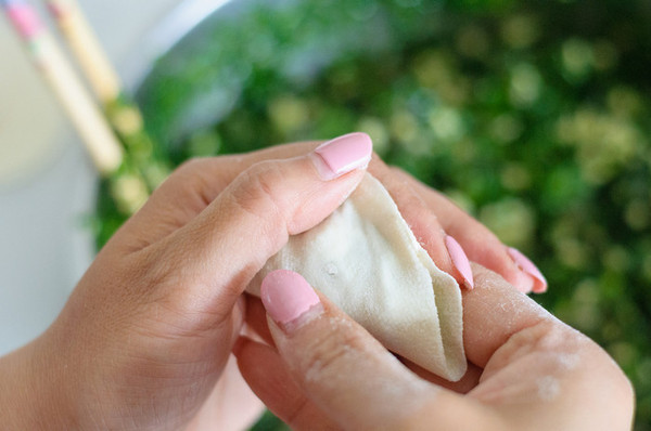 11、右手拇指與左手的食指壓住餃子皮的右側(cè),右手其余手指從外側(cè)抱住左手。