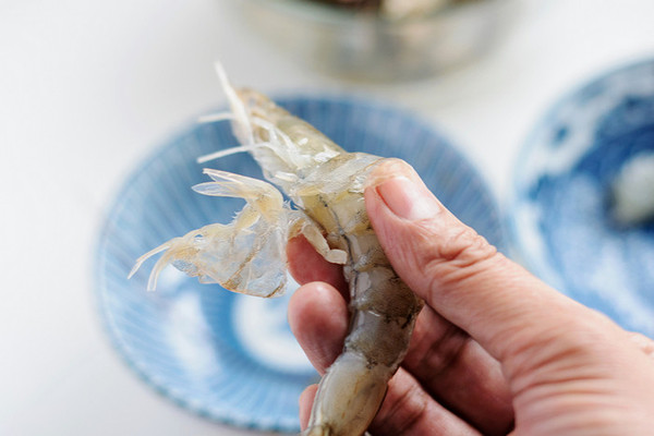 3、新鮮海蝦剝?nèi)ノr殼,剔除蝦腸蝦線。