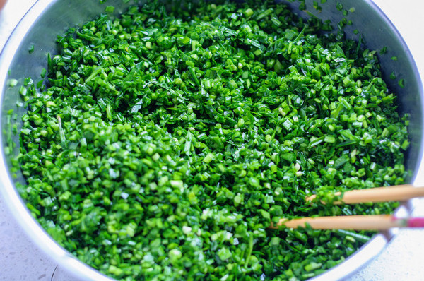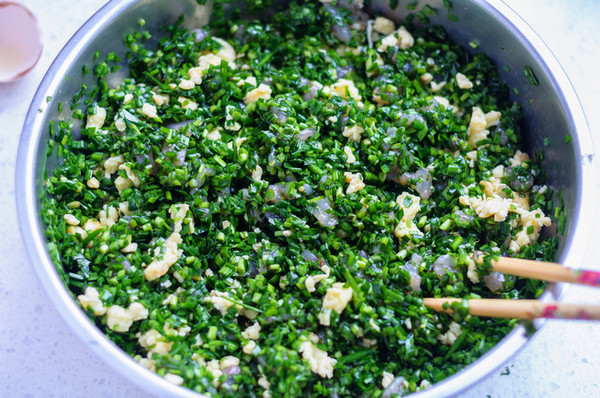 [食材]:面粉600g、韭菜800g、海蝦400g、油25g、精鹽2茶匙、料酒3茶匙、雞蛋3枚
