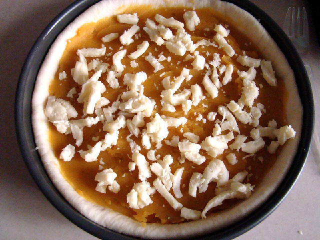 7,鋪上一層紅薯泥,撒上適量馬蘇里拉奶酪。
