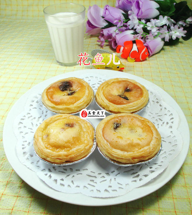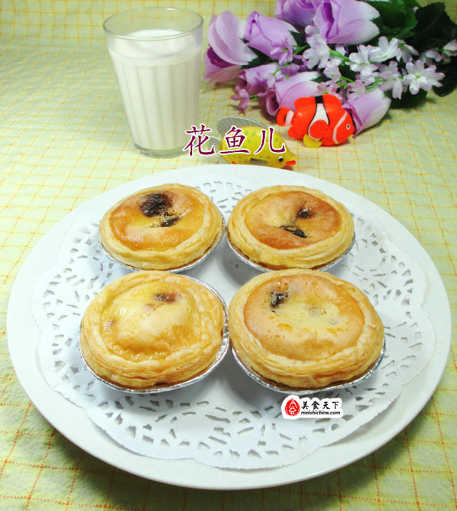 (4)然后,將蛋撻皮置入烤盤中,擱入桂圓肉、用勺子舀入牛奶蛋液。