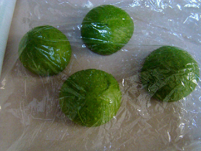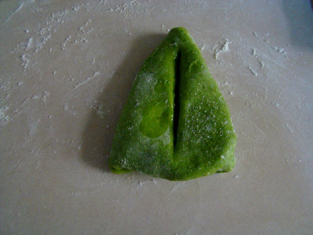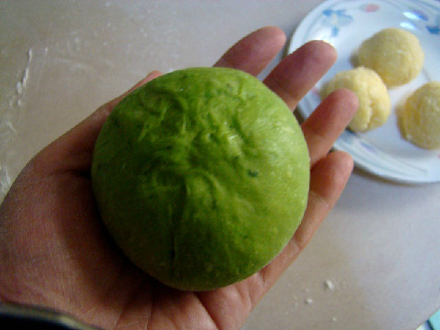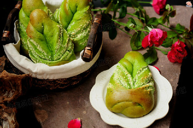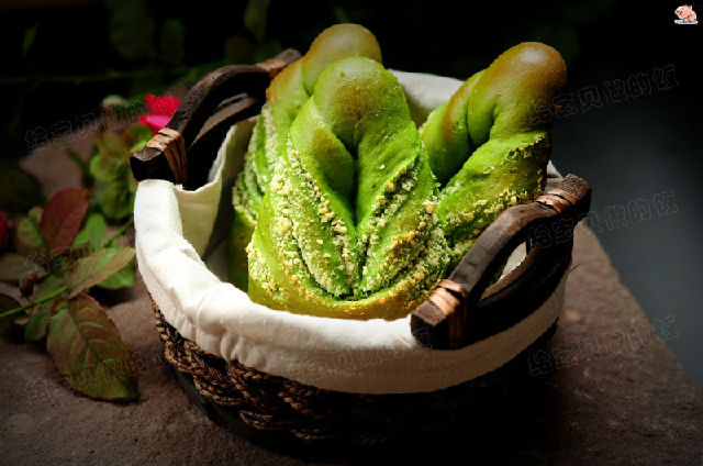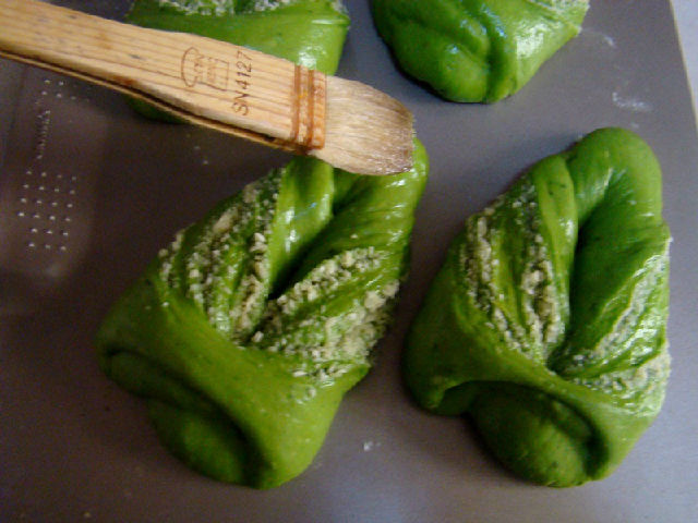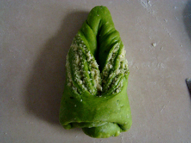 面團原料:高粉200克,細砂糖35克,鹽1/4小匙,蛋液35克,酵母粉3克,菠菜汁100克,黃油15克