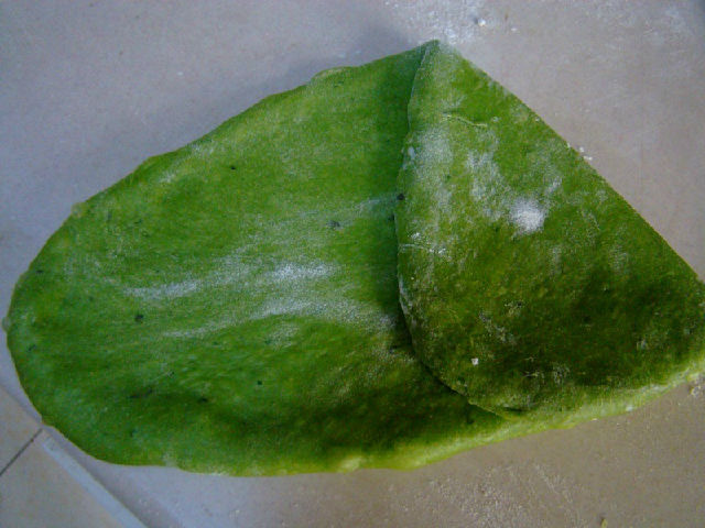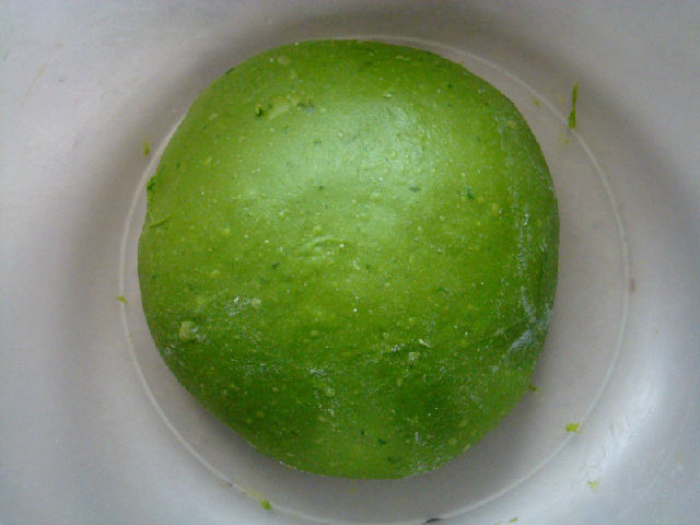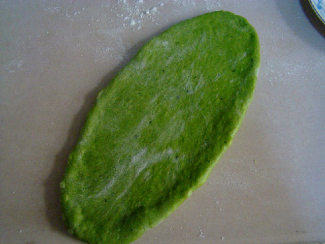 面團(tuán)原料:高粉200克,細(xì)砂糖35克,鹽1/4小匙,蛋液35克,酵母粉3克,菠菜汁100克,黃油15克