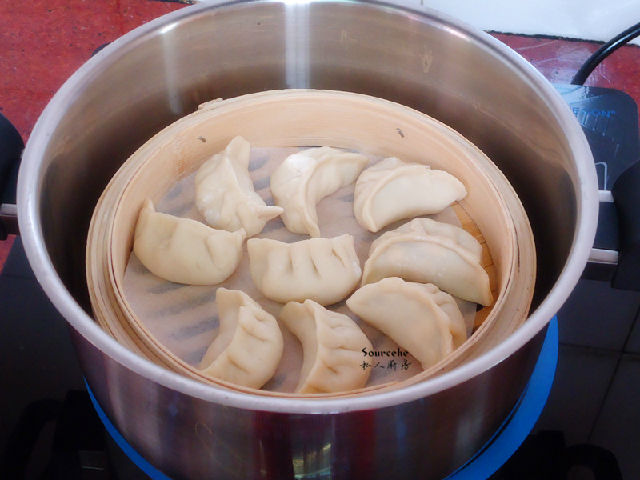 11.鍋中清水煮沸,把餃子蒸籠放入,蓋上蓋子;