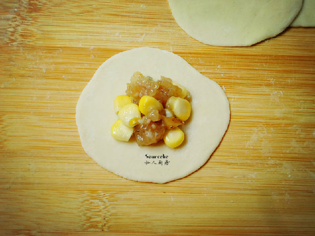 8.把玉米豬肉鮮放入餃子皮中;