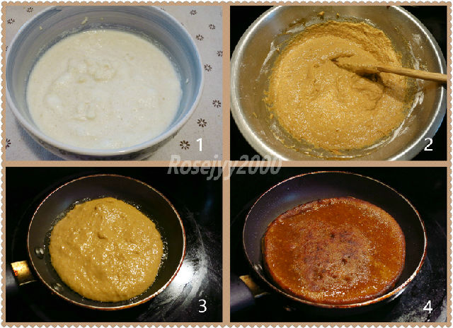 三、用一個(gè)約4.5英寸直徑的迷你平底鍋置爐上,中火,放油約1/2茶匙,用鍋鏟或毛掃輕掃均勻,倒入面糊,煎至面糊凝固和微焦;