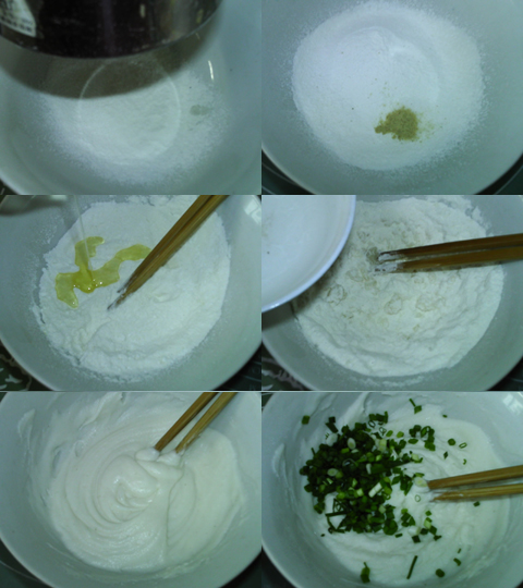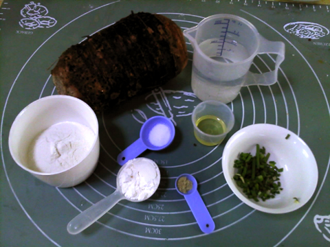 用料:芋頭150克,米粉65克,太白粉10克,玉米油15毫升,開水150毫升,鹽1/2小勺,細砂糖1/2小勺,白胡椒粉1/4小勺,蔥花適量