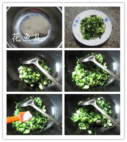 (4)燒鍋倒油燒熱,下入捏干水分的青菜翻炒翻炒。