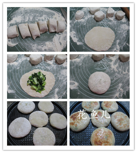 (6)然后,在硅膠墊撒上一些面粉,取和好的面團(tuán)揉勻分成6份,用搟面杖搟開,放上炒好的手捏菜包好,稍微按扁一下。
