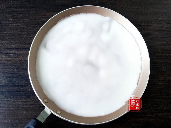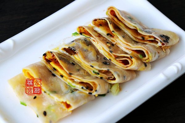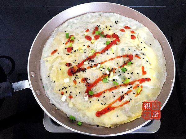 鍋底抹上一層極薄橄欖油,微微加熱后倒入面粉糊,轉(zhuǎn)動(dòng)不粘鍋,使面糊均勻鋪開;