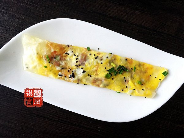 材料:橄欖油、雞蛋、面粉、芝麻、蔥花、番茄醬;