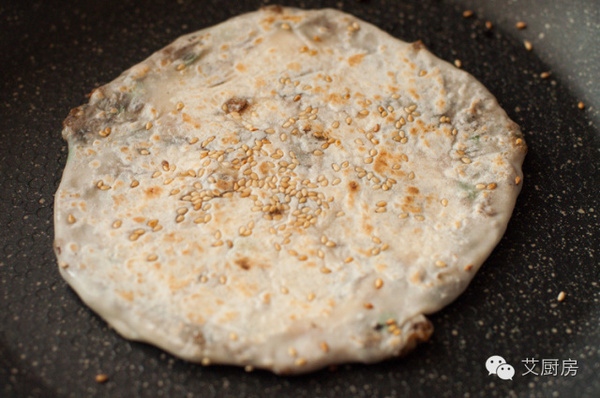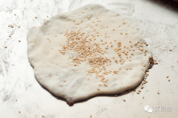7.收口朝下,輕輕壓扁,再用搟面杖輕輕搟開,可以灑一點(diǎn)兒白芝麻。