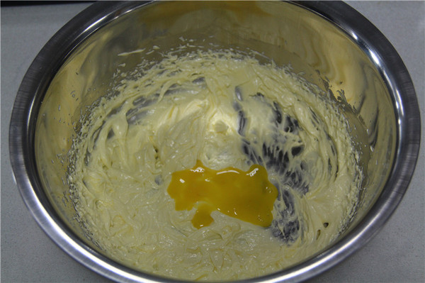 2、倒入半個(gè)蛋黃,繼續(xù)打發(fā)至蛋黃與黃油完全混合均勻