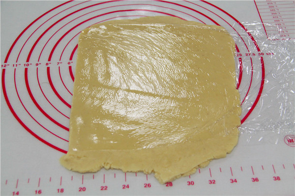 4、用手揉成為光滑的面團(tuán)后放在兩層保鮮膜的中間,然后搟成3毫米左右的片狀,放冰箱冷藏松馳半個(gè)小時(shí)