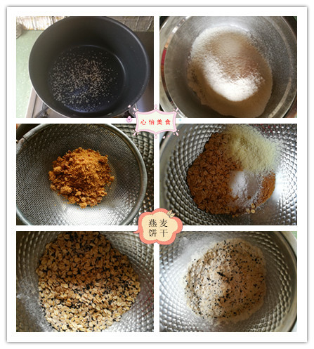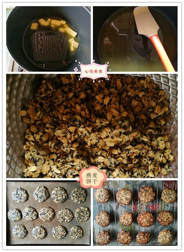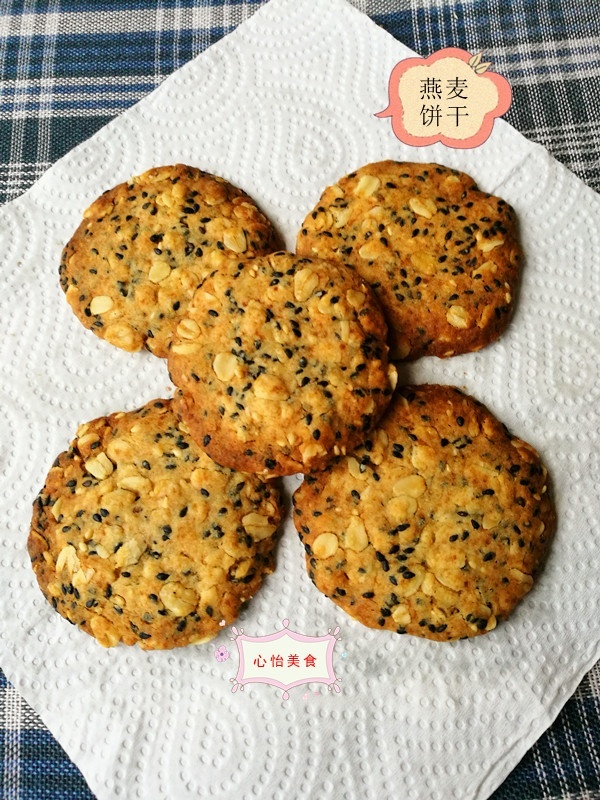 材料:低筋面粉75克,快熟燕麥50克,芝麻25克,約糖20克,糖粉10克,奶粉10克,鹽1克,無鋁泡打粉1克,黃油30克,色拉油30克,玉米糖漿15克。