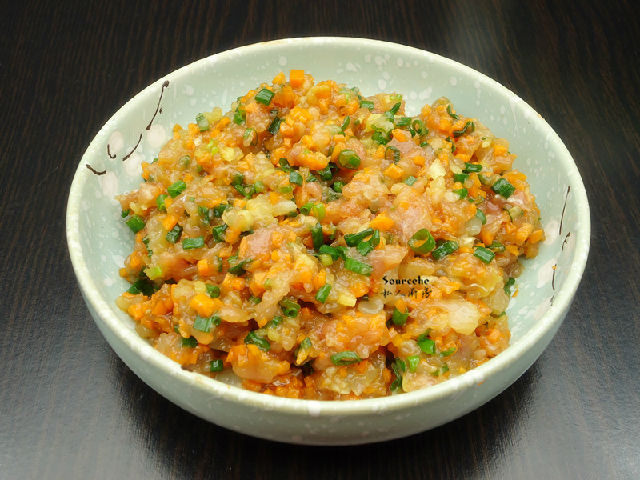 2.餃子餡:蝦仁200克、瘦肉100克、胡蘿卜100克、香蔥50克、橄欖油3ml、鹽3克、海鮮醬2ml、生抽3ml、生姜5克