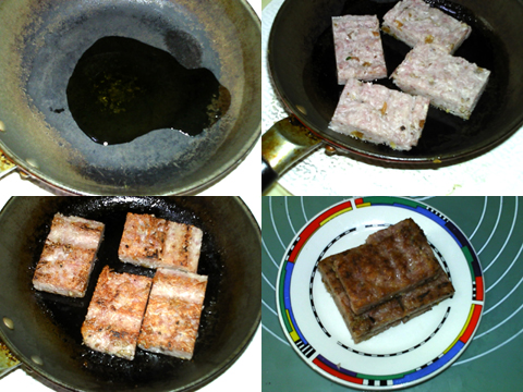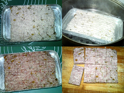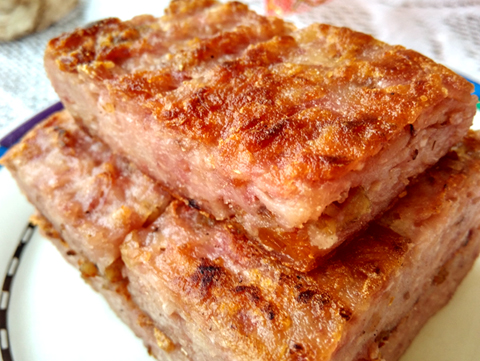 鋪在刷油的盤子上,壓實(shí)。放入沸水鍋中,大火蒸15分鐘。熟透后出鍋,冷卻后放入冰箱冷藏過夜。取出,切成大小相等的塊。
