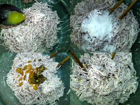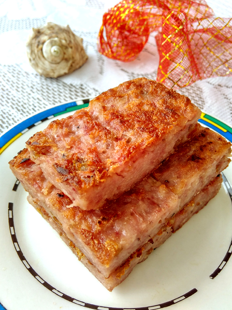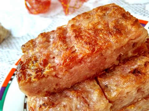 芋頭擦絲,據(jù)說是越細(xì)越好。所有材料混合在一起蒸熟,香芋立馬就呈現(xiàn)出漂亮的紫色。不急著吃,就放冰箱過夜,再來切塊煎。據(jù)說,這樣才不會(huì)散開。