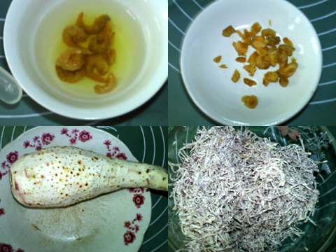 海米洗凈,用溫水泡發(fā)。切碎,備用。芋頭洗凈去皮。刨成細(xì)絲,加入鹽,油,拌勻。加入米粉,拌勻,讓芋頭絲均勻地粘上米粉。加入海米粒和肉臊,拌勻。
