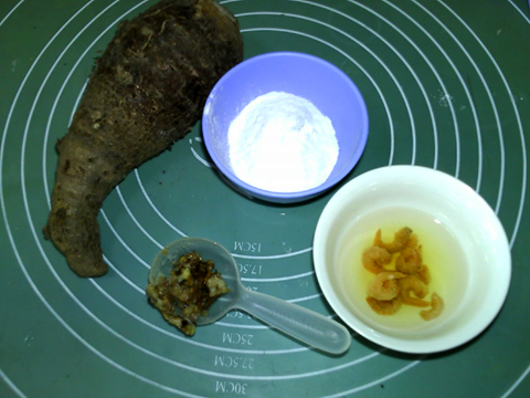 用料:香芋200克,粘米粉35克,海米1小勺,香菇肉臊1大勺,鹽適量,油適量