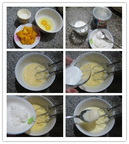 食材:蛋撻皮10個(gè)、雞蛋2只、芒果185克(已去皮切開)、牛奶70克、綿白糖10克、煉乳、低筋面粉5克