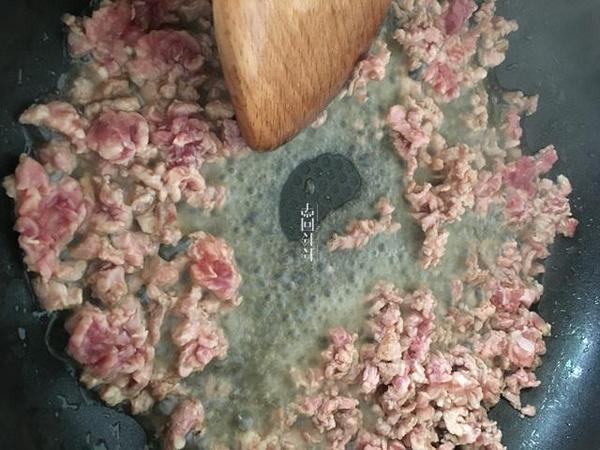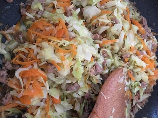 肉是剁成丁,喜歡可以剁成泥,因?yàn)樽龅氖鞘祓W料所以個(gè)人覺的丁炒的時(shí)候不會(huì)粘成一團(tuán)。包菜切好放在一處晾干或者可以加點(diǎn)油拌一拌以免出水。一切就緒就可以炒制,加豬油加蝦皮更香哦