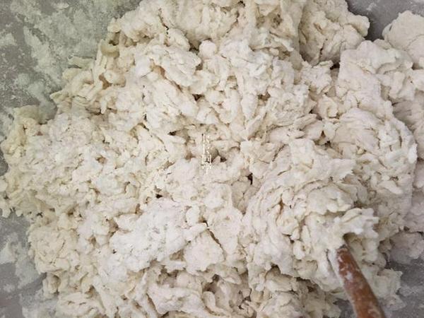 2.開始慢慢加水,一點(diǎn)點(diǎn)加,一邊用筷子攪拌,使面粉成面絮狀,就可以揉面,看情況是否再加水。PS:不管面多與少就以這個(gè)準(zhǔn)則加水