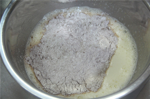 3、低筋面粉、可可粉混合過篩,篩好后加入雞蛋牛奶液中攪拌均勻