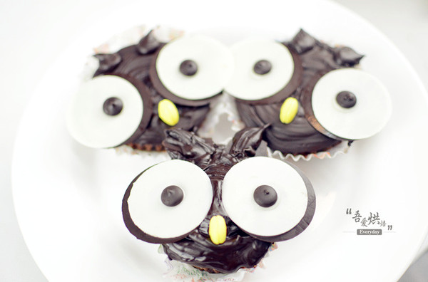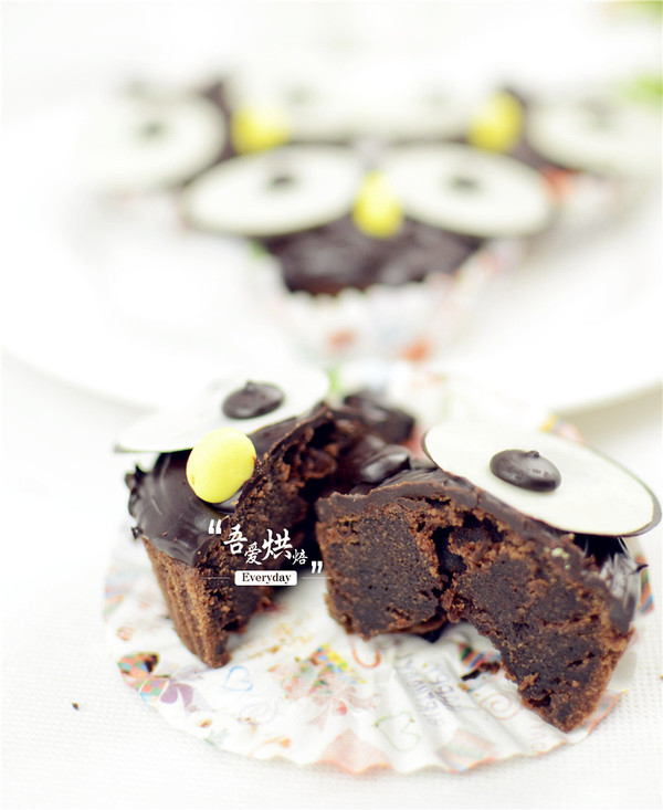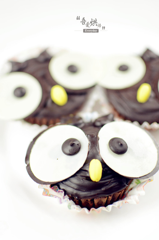 7、貓頭鷹眼睛做法:取黑、白巧克力圓片各一片,(白巧克力圓片稍小些)將兩片重疊在一起,在白巧克力上粘一顆黑巧克力豆做成眼珠即可;烤好巧克力蛋糕后,自然冷卻,在蛋糕表面涂上巧克力液;將做好的眼睛粘上,在兩只眼睛下方再粘上一顆黃色的巧克力豆做成鼻子即可