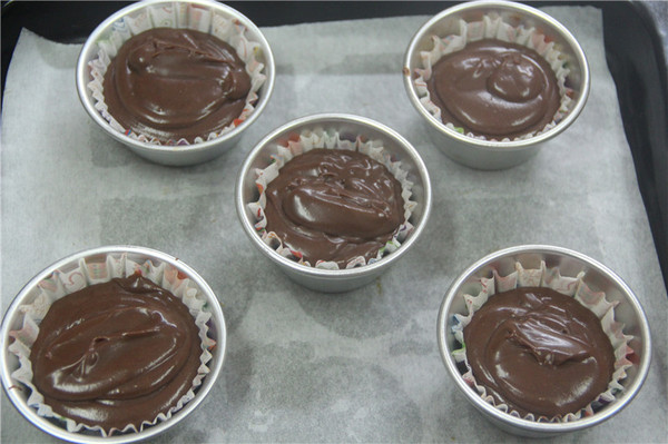 5、將攪拌好的面糊裝入裱花袋,擠入紙杯中(中號紙杯,8分滿)
